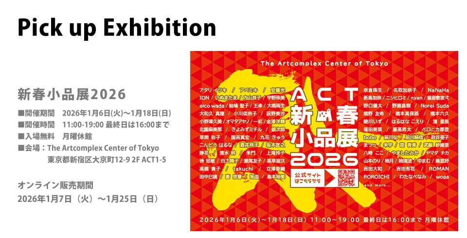 毎週開催される展覧会の作品やACT取り扱い作家の作品、アートグッズなどを取り扱っています。 メールマガジンでも展覧会情報を配信していますので、ぜひご登録をお願いいたします!