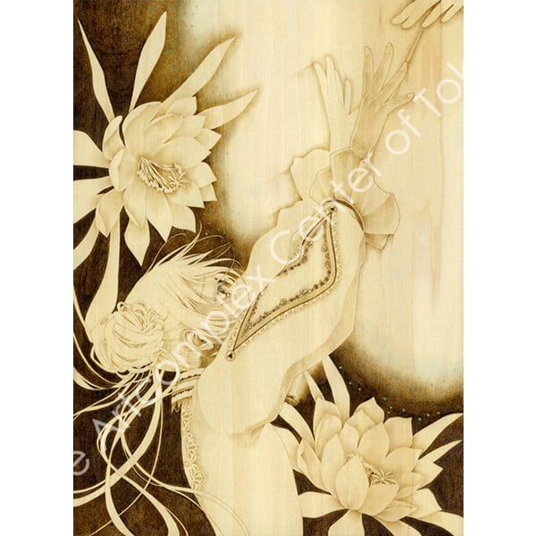 木を焦がして描く「ウッドバーニング」という手法で、かわいいものたちや、想い焦がれるキモチを焦がし描いています。