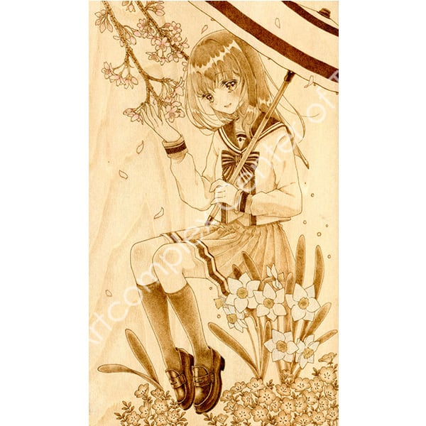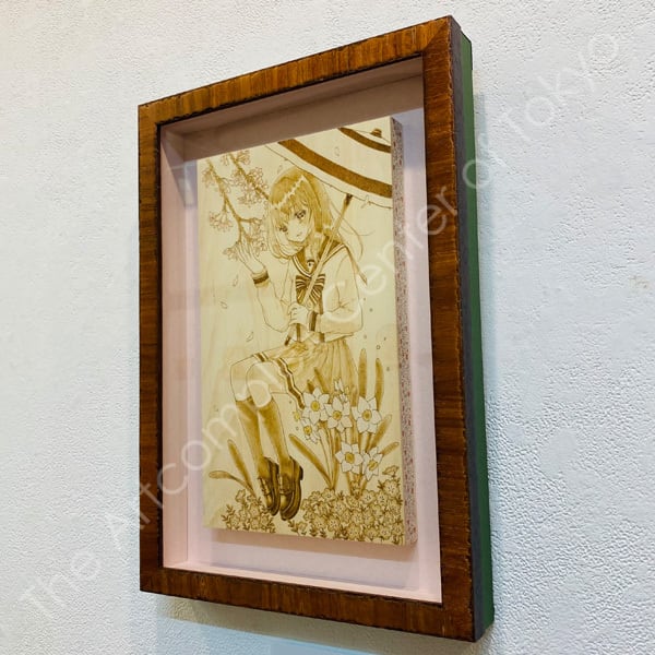 木を焦がして描く「ウッドバーニング」という手法で、かわいいものたちや、想い焦がれるキモチを焦がし描いています。