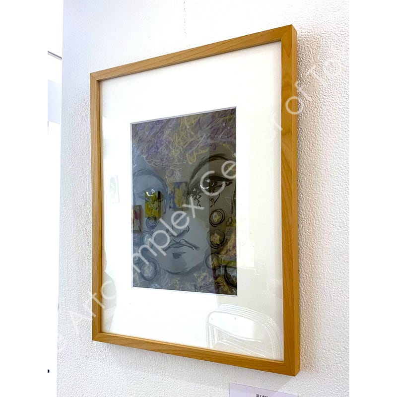 ミックスメディアペーパー、墨液、オイルクレヨン、額付き