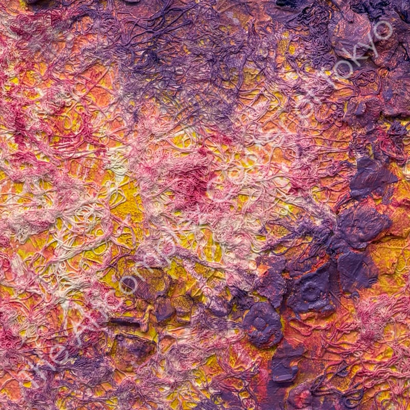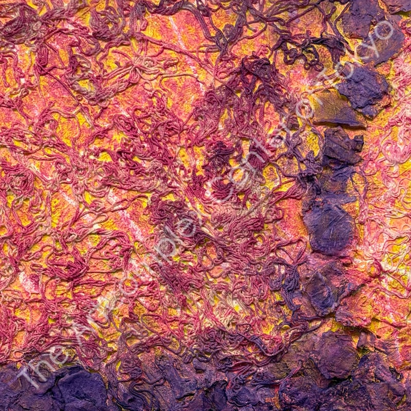 Acrylic paint, Paris white Gesso, recycled paper and cotton yarn on hemp canvas.
