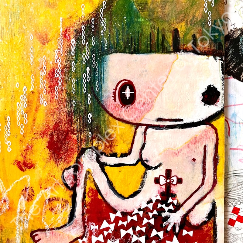 木製パネル、アクリル絵の具、色鉛筆、ミクストメディア、バーニッシュ