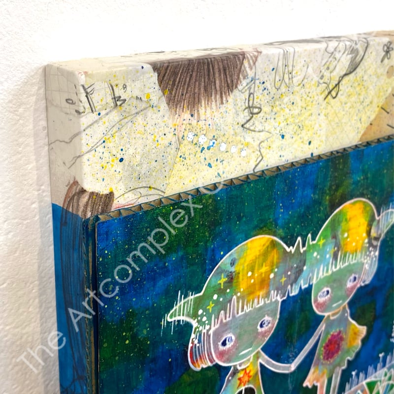 木製パネル、あの頃のダンボール、アクリル絵の具、色鉛筆、ミクストメディア、バーニッシュ