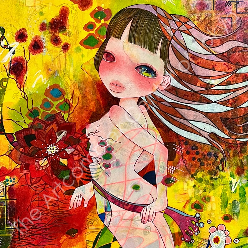 木製パネル、アクリル絵の具、色鉛筆、ミクストメディア、バーニッシュ