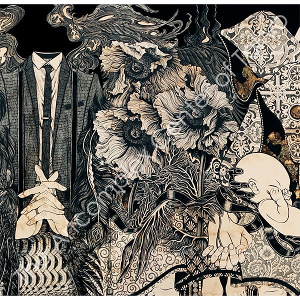 インク、コーヒー、アクリル絵の具、色鉛筆、アルミ箔