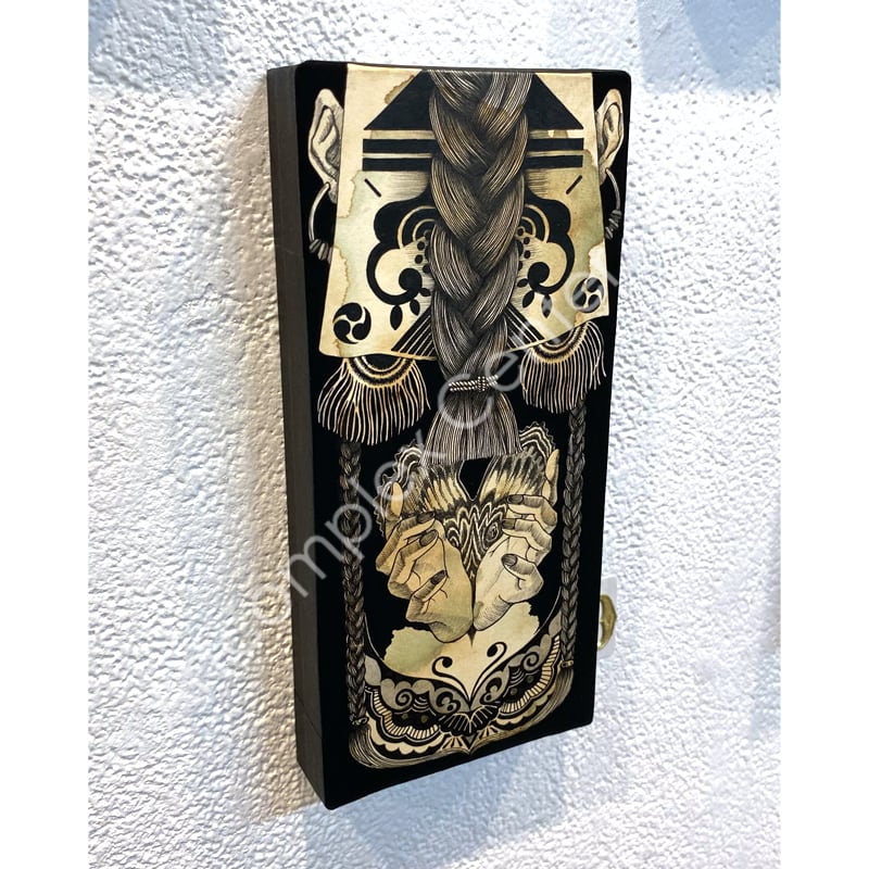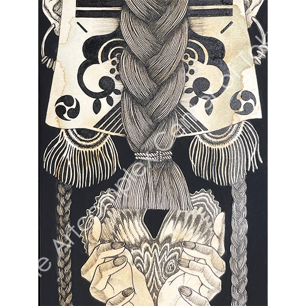 インク、コーヒー、アクリル絵の具、色鉛筆、アルミ箔