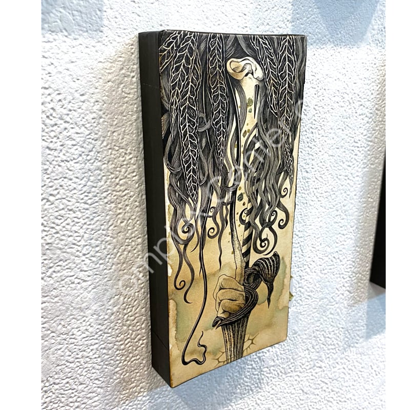 インク、コーヒー、アクリル絵の具、色鉛筆、アルミ箔