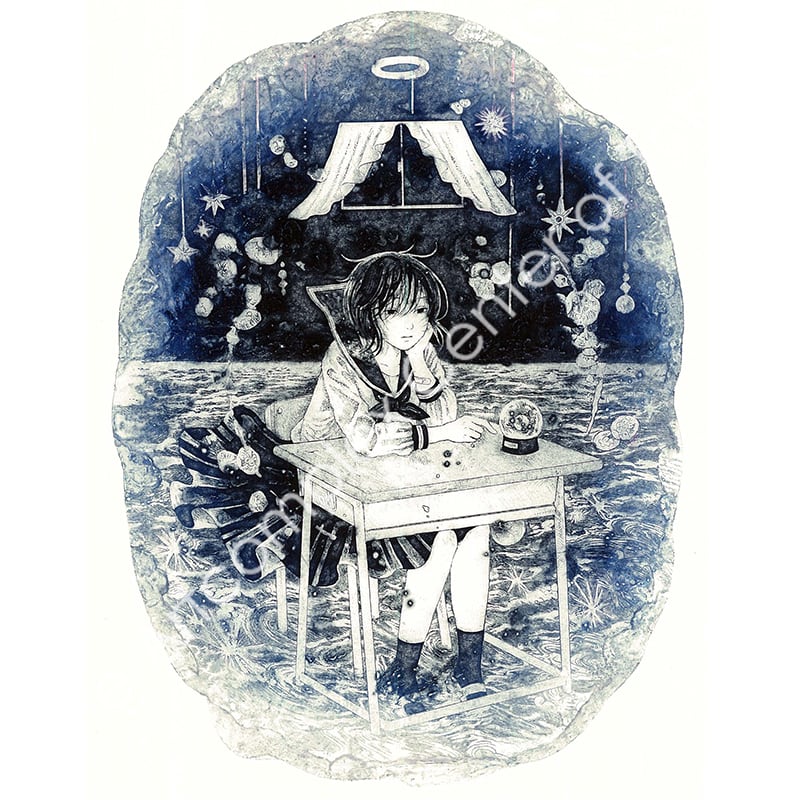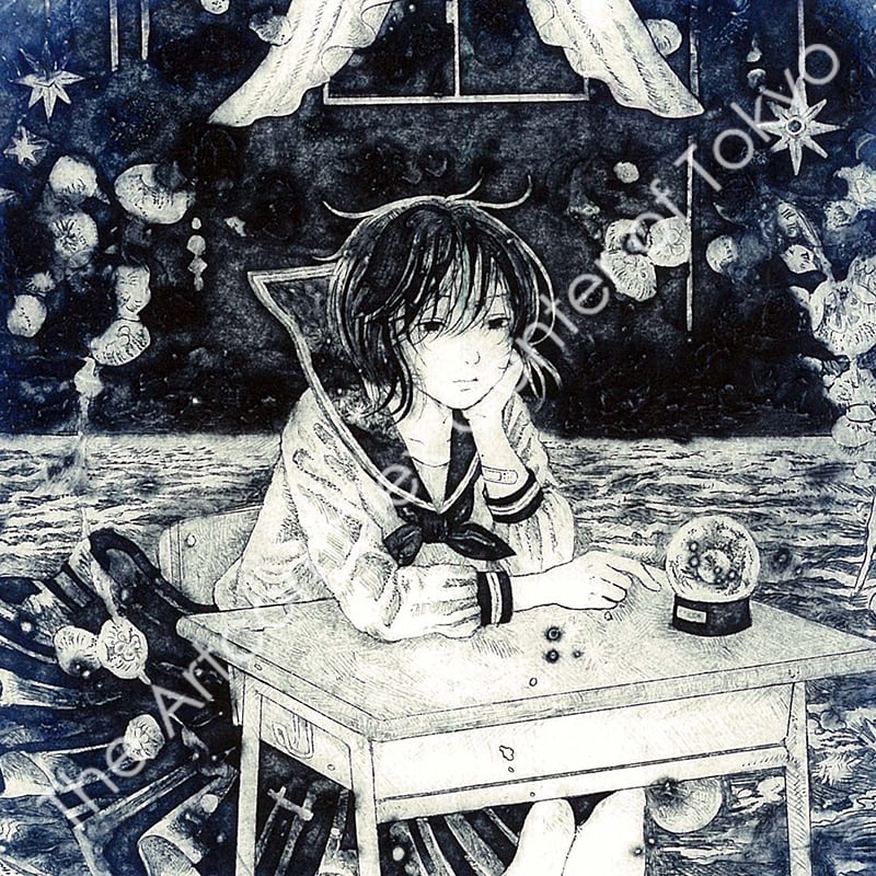 紙版画(板紙凹凸版)を中心とした手法で少女像を描く。心の揺らぎ・光とかげりを主題に制作している。