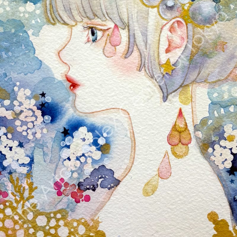 夜空を貫く彗星のように美しい一瞬の感覚の閃きを、水彩の滲みと重なりの中に閉じ込めた原画作品。