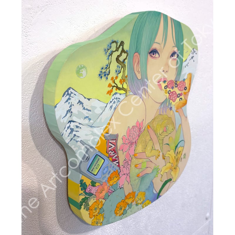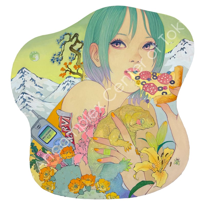 私の作品は、そういったトロピカルな情景をベースに、古典から引用される吉祥モチーフとSNSなどから引用される現代のオブジェクトを組み合わせ、折り重なる入れ子状の構造の中に、現代における楽園を描いています。