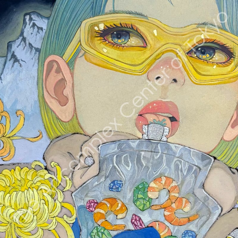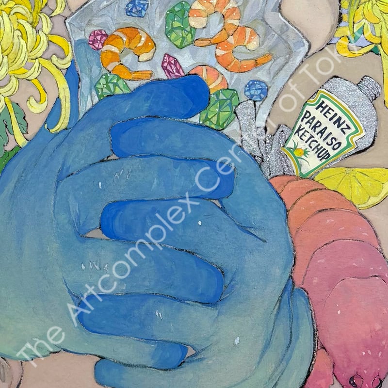 私の作品は、そういったトロピカルな情景をベースに、古典から引用される吉祥モチーフとSNSなどから引用される現代のオブジェクトを組み合わせ、折り重なる入れ子状の構造の中に、現代における楽園を描いています。