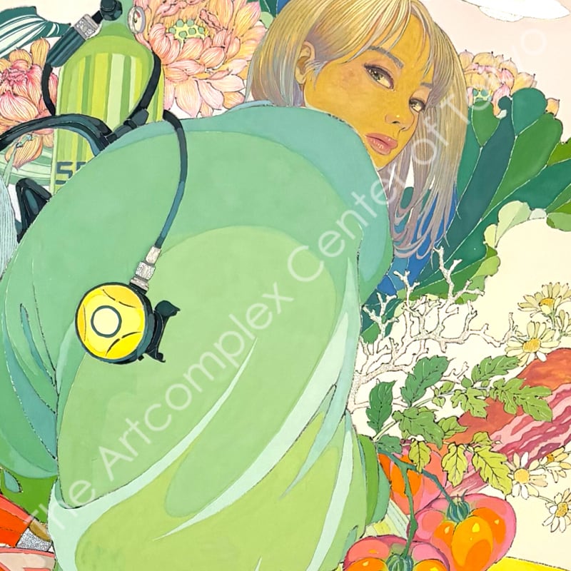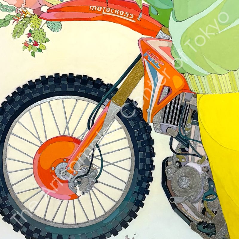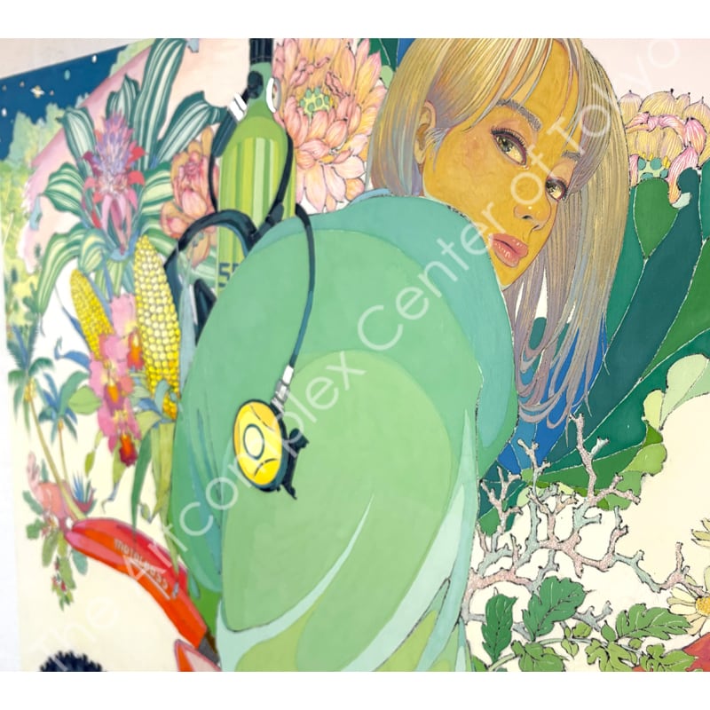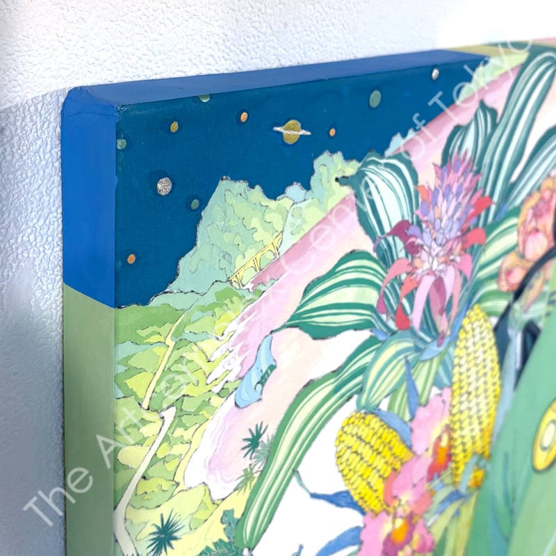 私の作品は、そういったトロピカルな情景をベースに、古典から引用される吉祥モチーフとSNSなどから引用される現代のオブジェクトを組み合わせ、折り重なる入れ子状の構造の中に、現代における楽園を描いています。