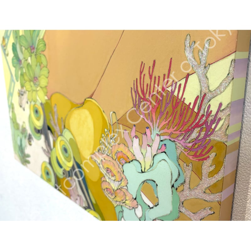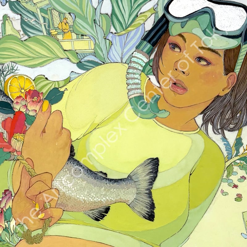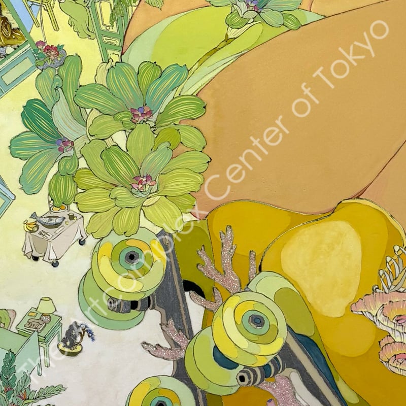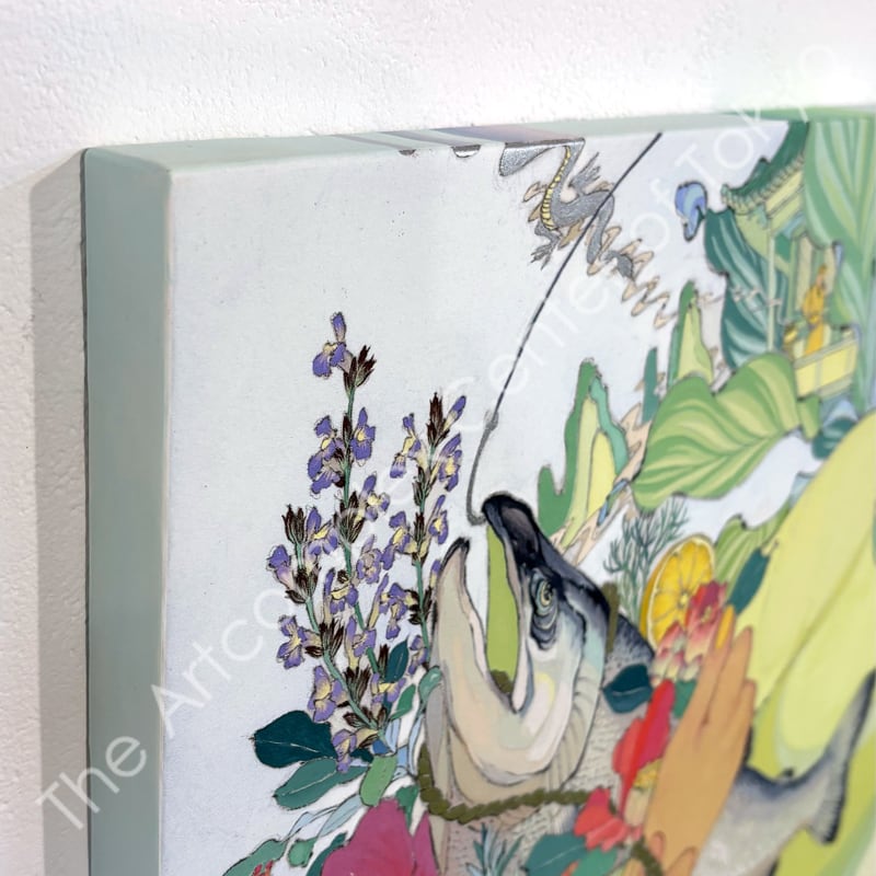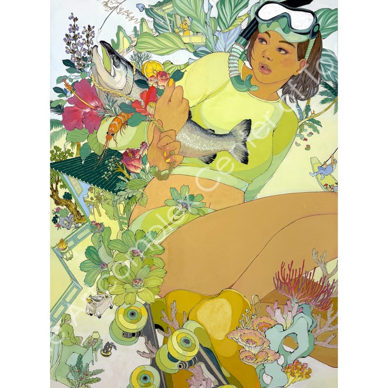 私の作品は、そういったトロピカルな情景をベースに、古典から引用される吉祥モチーフとSNSなどから引用される現代のオブジェクトを組み合わせ、折り重なる入れ子状の構造の中に、現代における楽園を描いています。