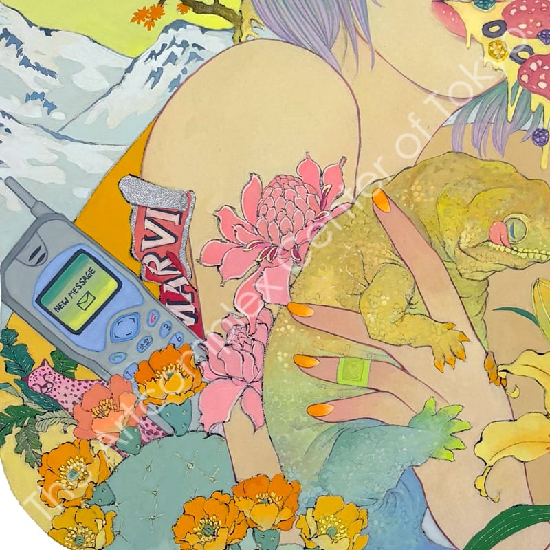 私の作品は、そういったトロピカルな情景をベースに、古典から引用される吉祥モチーフとSNSなどから引用される現代のオブジェクトを組み合わせ、折り重なる入れ子状の構造の中に、現代における楽園を描いています。