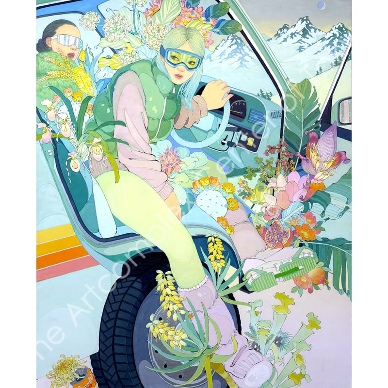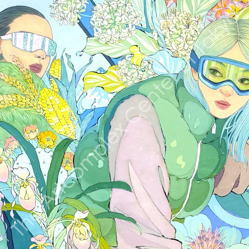 私の作品は、そういったトロピカルな情景をベースに、古典から引用される吉祥モチーフとSNSなどから引用される現代のオブジェクトを組み合わせ、折り重なる入れ子状の構造の中に、現代における楽園を描いています。