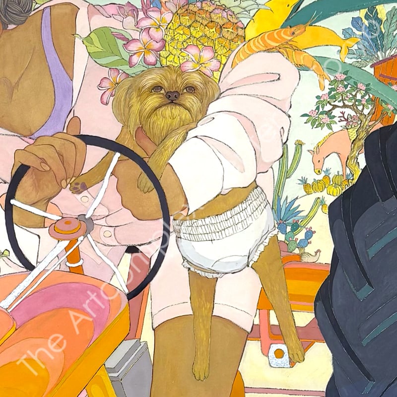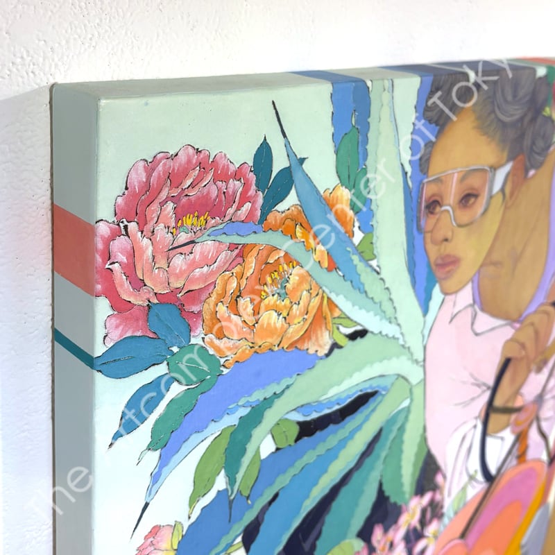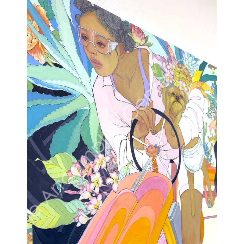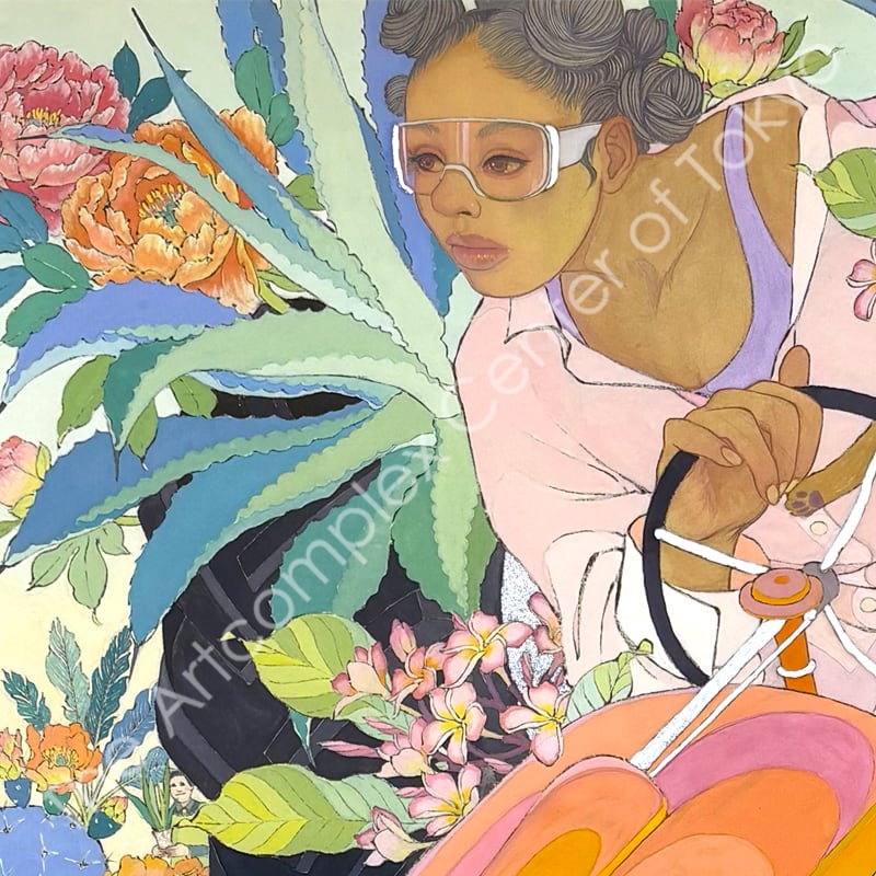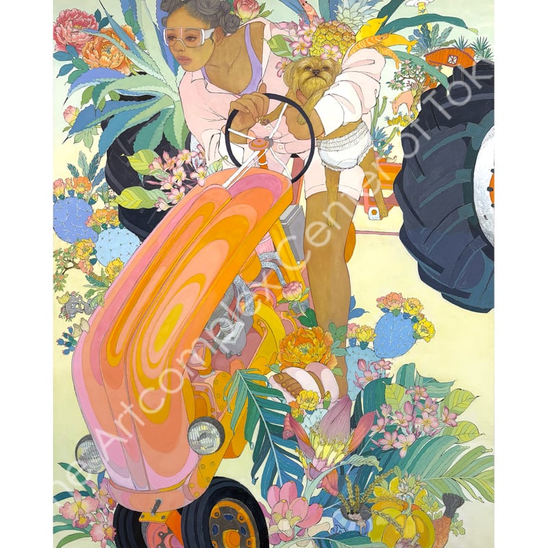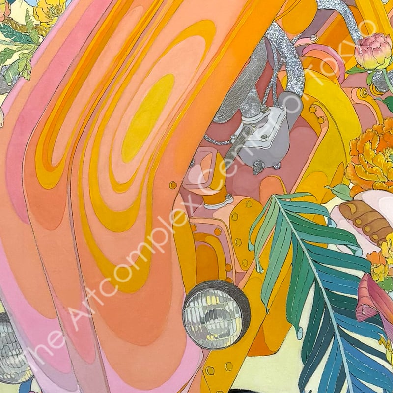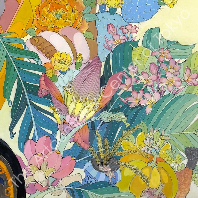 私の作品は、そういったトロピカルな情景をベースに、古典から引用される吉祥モチーフとSNSなどから引用される現代のオブジェクトを組み合わせ、折り重なる入れ子状の構造の中に、現代における楽園を描いています。