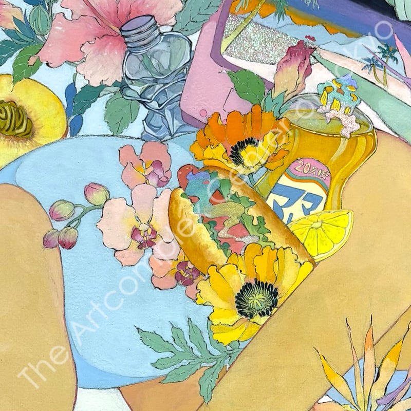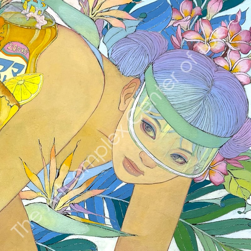 私の作品は、そういったトロピカルな情景をベースに、古典から引用される吉祥モチーフとSNSなどから引用される現代のオブジェクトを組み合わせ、折り重なる入れ子状の構造の中に、現代における楽園を描いています。