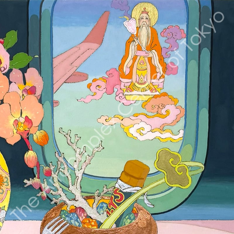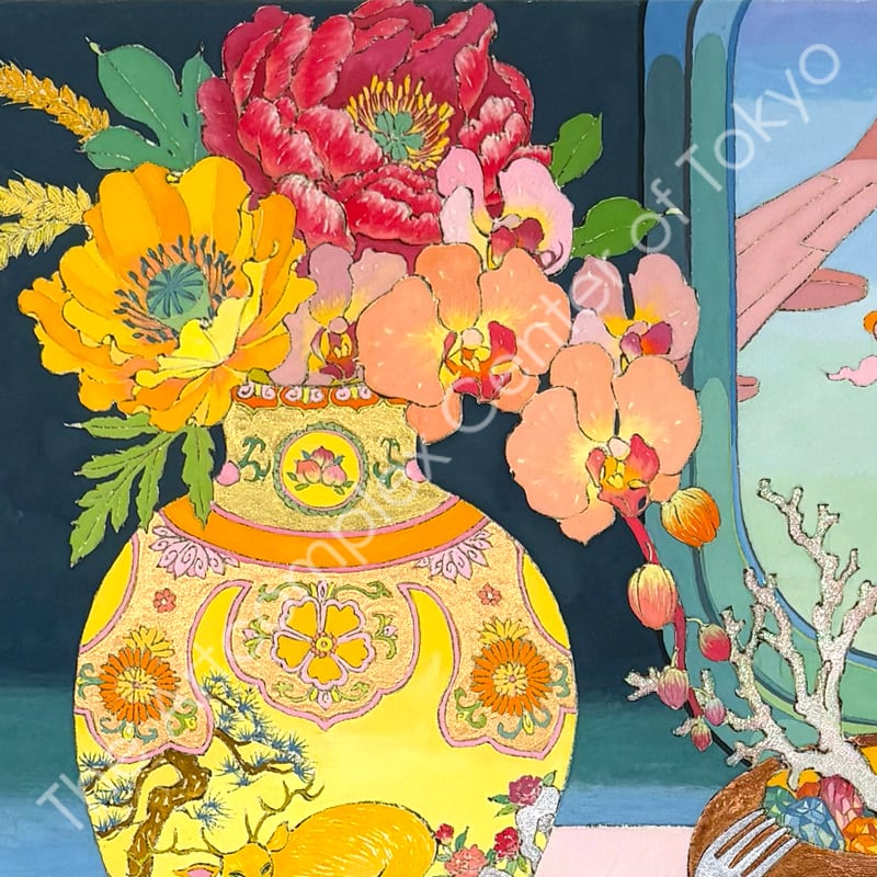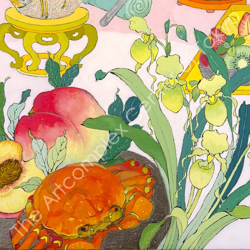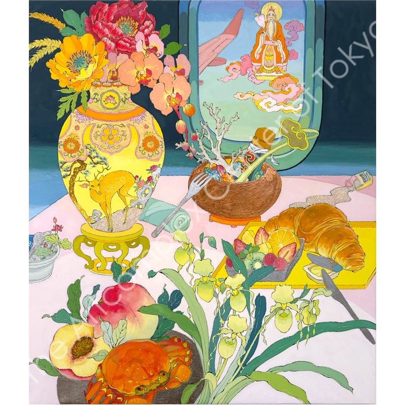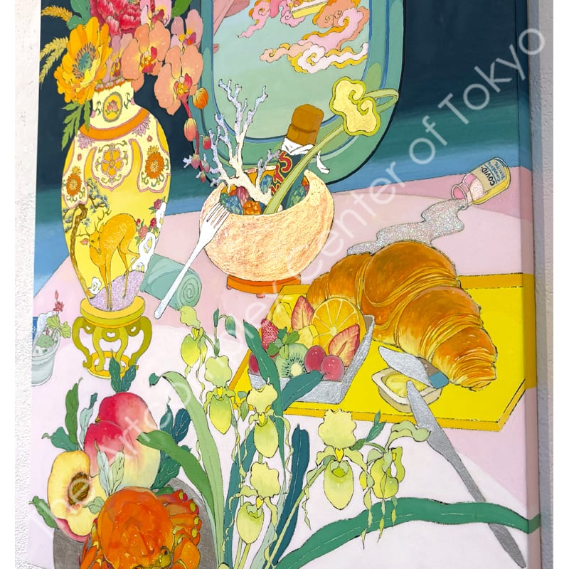 私の作品は、そういったトロピカルな情景をベースに、古典から引用される吉祥モチーフとSNSなどから引用される現代のオブジェクトを組み合わせ、折り重なる入れ子状の構造の中に、現代における楽園を描いています。