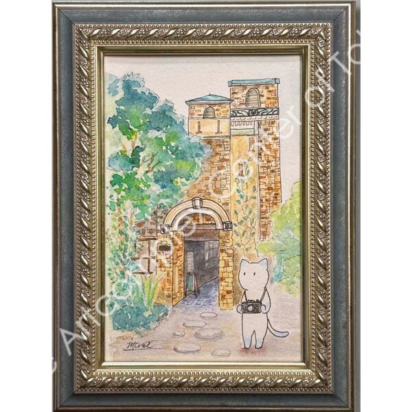 透明水彩、ペン/額付き