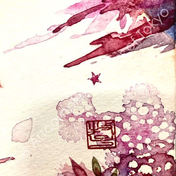 また、水を多く含んだ絵の具を筆でサッと弾き飛ばす「しぶき」の表現は、あふれ出るエネルギーをイメージしています。