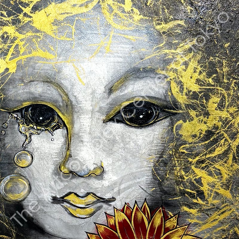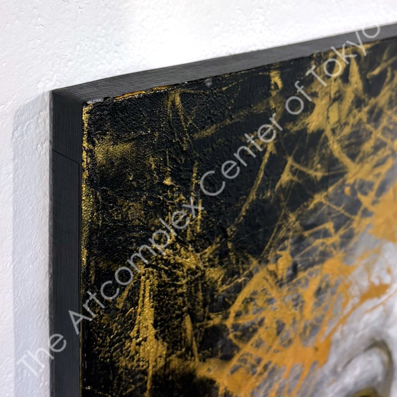 麻キャンバス、ペーパーペースト、墨液、アクリル、金泥、額付き