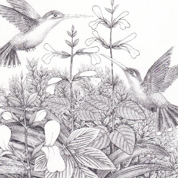 エングレービングとメゾチントの花鳥図を展示します。